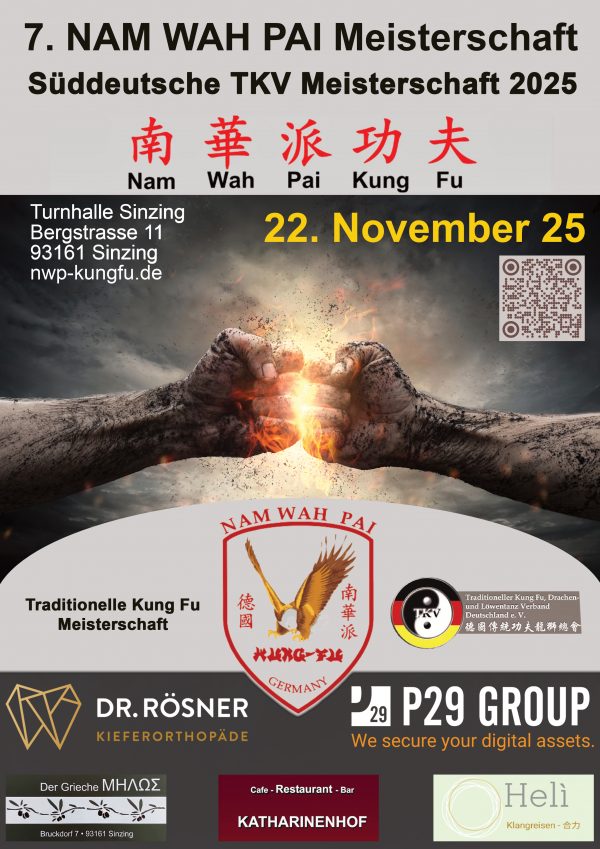 Die süddeutsche Meisterschaft des traditionellen Kung Fu Verband Deutschland (TKV) fand dieses Jahr erneut in der Turnhalle Sinzing statt. Dank der engagierten Organisation von Shifu Alexander Sonnberger und der Teilnahme von über 150 motivierten Sportlerinnen und Sportlern wurde die Veranstaltung zu einem Highlight für rund 200 Zuschauer. Aus ganz Deutschland reisten Vertreter aus 15 Schulen verschiedener Stilrichtungen an, um sich in vielfältigen Disziplinen zu messen.